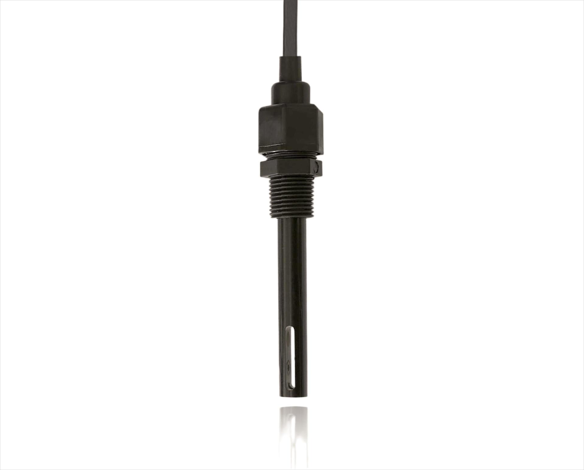 The online conductivity sensor features a built-in NTC temperature sensor and compensation algorithm, automatically correcting temperature-induced measurement variations. It communicates via RS485 interface with standard Modbus protocol.