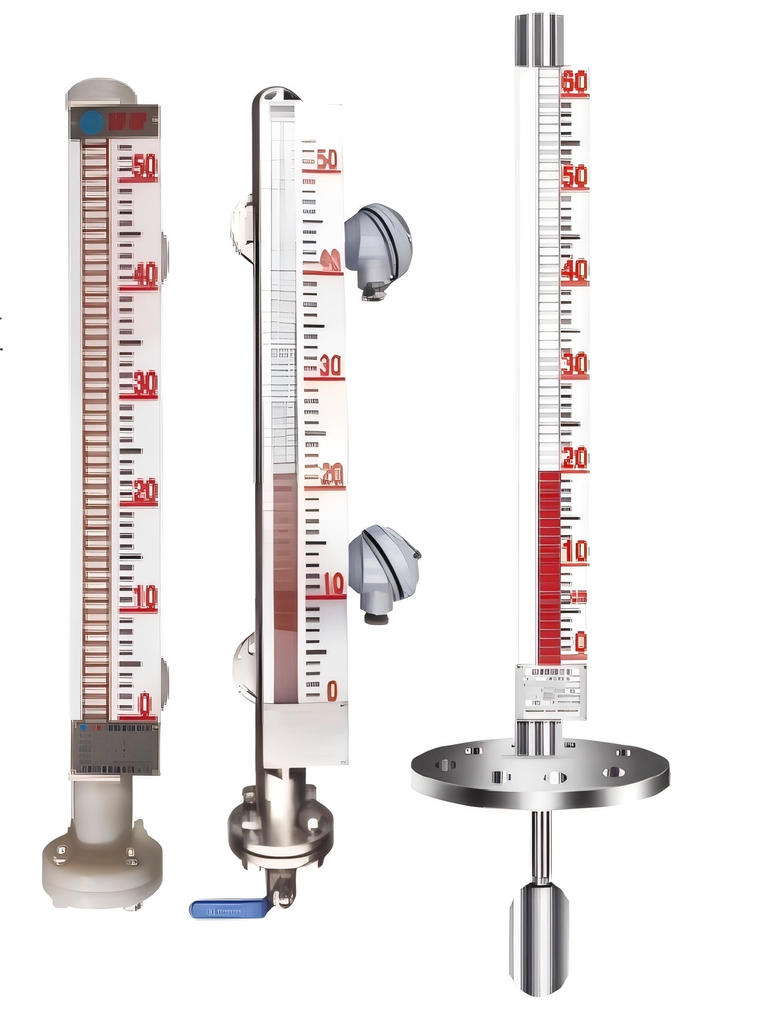 Magnetic flip plate liquid level meter is the use of bulk tube and tank(or container equipment) to form a communication device, so that the level of the two is the same, under the action of liquid buoyancy, when the liquid level rises(falls), the float on the liquid surface rises (falls), the permanent magnetic steel in the float under the action of magnetic coupling, driving the same with magnetic red and white flip beads for 180°. Thus, the liquid level height can be clearly and intuitively indicated through the scale of the red and white dividing line in the box board. With remote transmitter and magnetic switch, it can easily output 4~20mA or switch signal to achieve remote control.